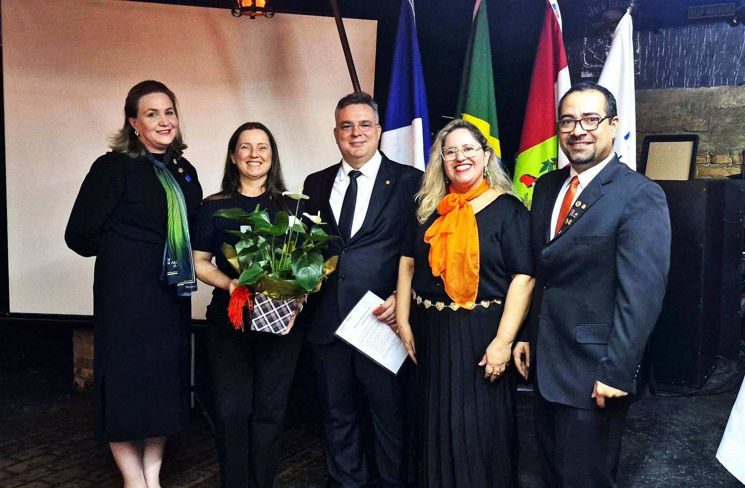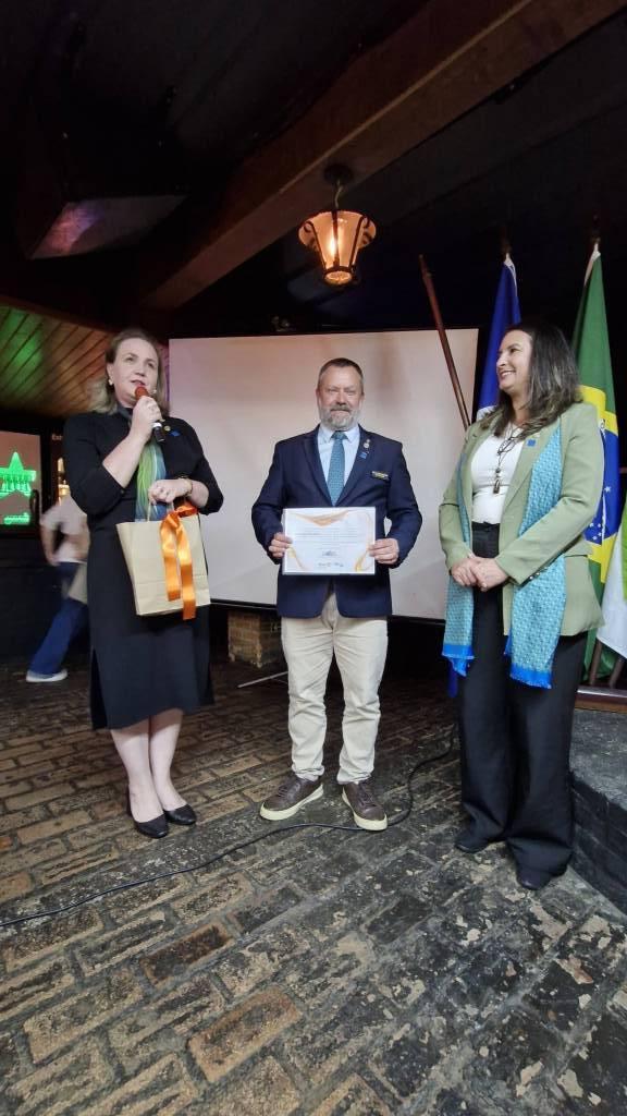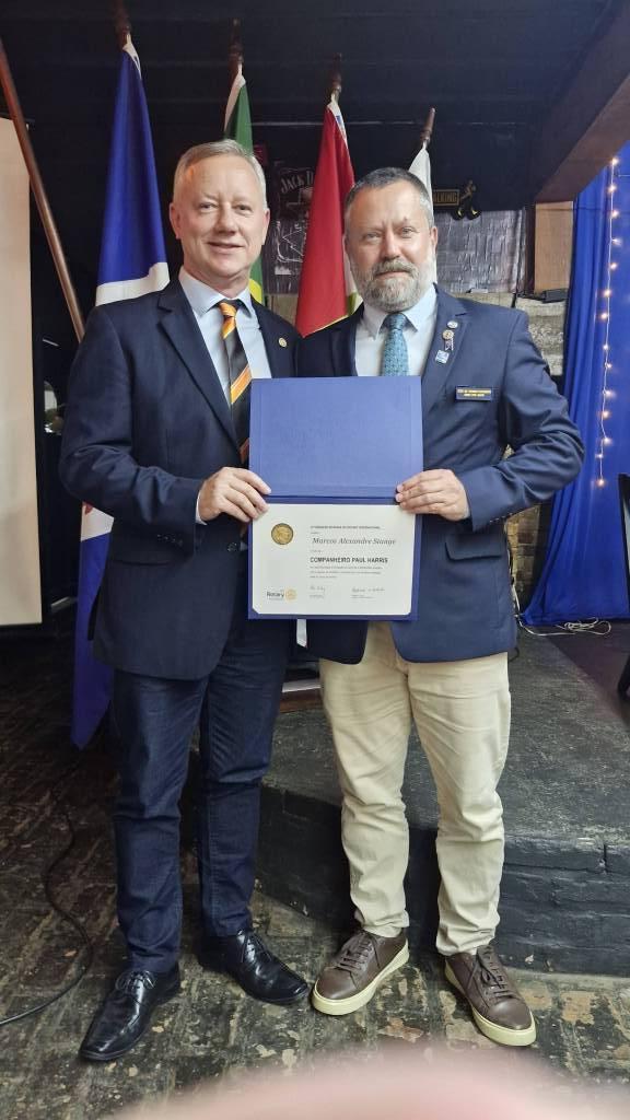 Outro instante de profunda emoção foi a entrega do título de Companheiro Paul Harris ao associado Marcos Stange, em reconhecimento à sua dedicação e contribuição ao Rotary International. Um gesto que simboliza não apenas o apoio à Fundação Rotária, mas também o compromisso com a construção de um mundo mais justo e solidário.