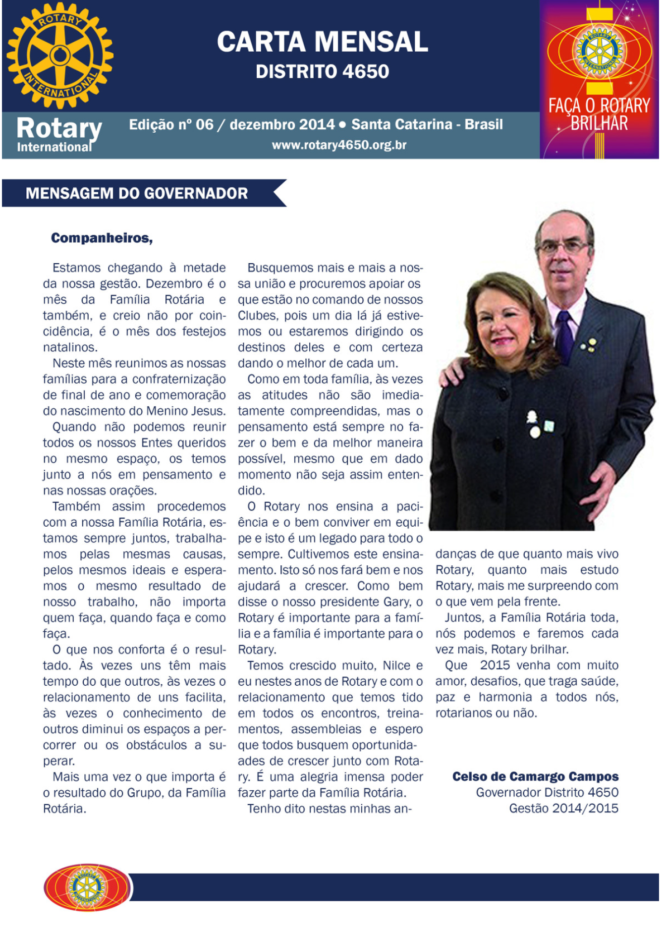 A Carta Mensal do mês de Dezembro de 2014 já está disponível para visualização. Acesse e confira o que de melhor vem ocorrendo no Distrito 4650.