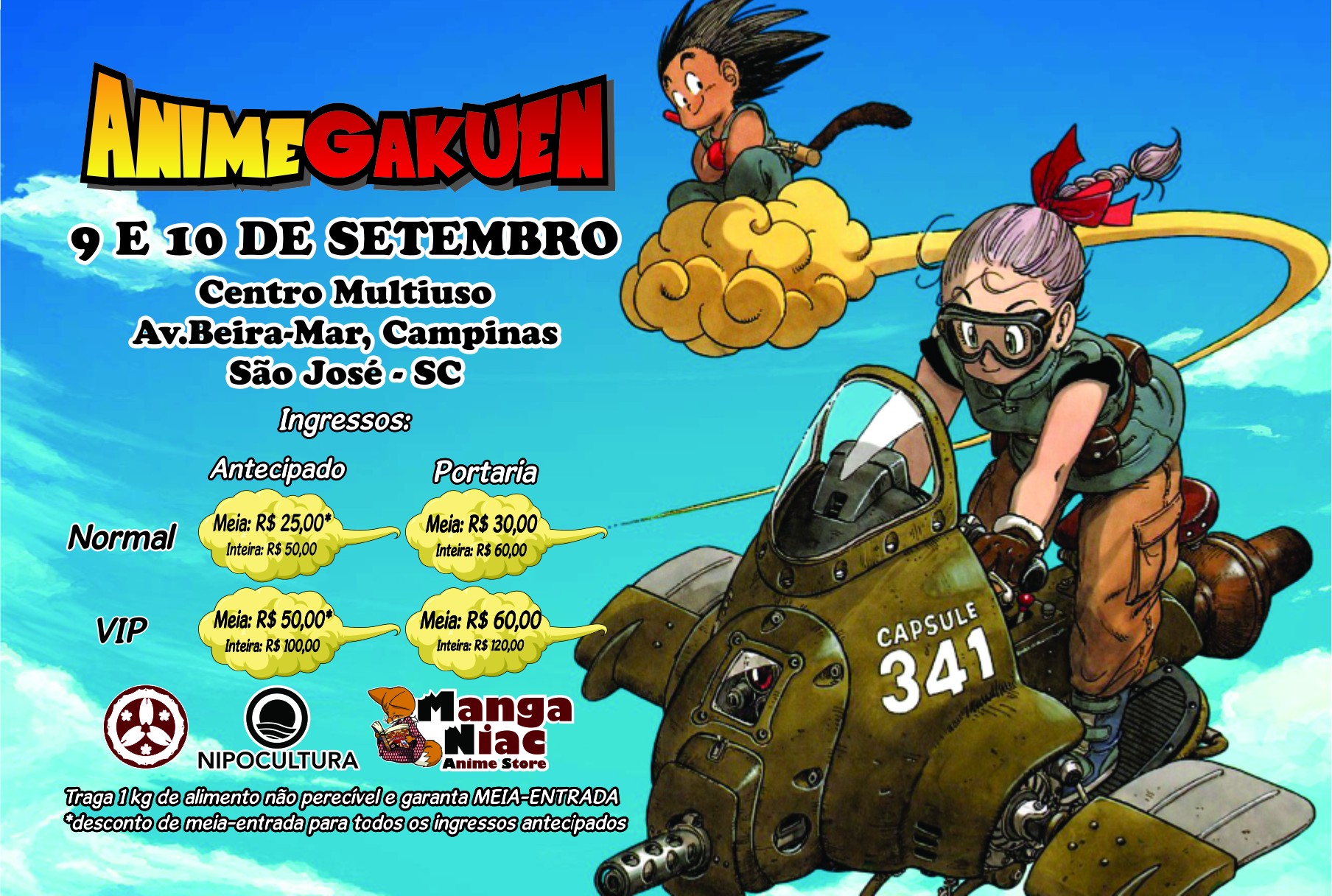 O ANIME GAKUEN é um evento de cultura pop-japonesa, mais voltado para o anime e mangá, com temática baseada nso "Bunkasai" (traduzindo do japonês: Evento Cultural). No envento teremos apresentação de shows de dança, canto, música, teatro e artes marciais. Além de vendas de produtos ou comida japonesa. A parceria realizada com o Rotary Club de Florianópolis está na destinação dos alimentos a serem doados no evento, que darão desconto de 50% no valor do ingresso, serão destinados aos projetos sociais do Clube. Vamos participar, prestigiar a cultura japonesa cuja tradição tem muito a nos ensinar e praticar a fraternidade. O Rotary, junto com seus parceiros, faz a diferença! VAMOS DOAR ALIMENTOS E TER DESCONTOS DE 50% NO INGRESSO.